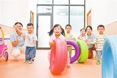 “准备好了开始咯,在小小的花园里面挖呀挖呀挖……”8月8日,走进南昌市青云谱区三家店街道幼谊南莲社区托育中心,老师们通过欢快的音乐增强孩子的协调能力。随后,稚嫩的童声跟着老师一起合唱,现场一片欢乐。 “现在国家政策好,在家门口开办托育班。我们还可以领取5个月的托育服务消费券,每月少交200元。”家住保利美的云筑小区的林凤清谈及普惠托育政策,脸上洋溢着笑容。“孩子上托育班,我和爱人就可以安心上班了。这里环境和服务都很好,我们还能通过手机实时看到孩子的动态,非常放心。” 幼谊南莲社区托育中心主任王慧告诉记者,中心配备了各种适龄设施,定期组织托育师资培训,提升从业人员的专业素养,并制定科学合理的托育课程。记者走进一间教室,看到精心装修的软包墙面地面,根据孩子身高特点修建的幼儿洗手台、卫生间等,各种装饰图案充满童趣。有的孩子在听老师讲绘本故事,有的孩子在搭积木、做手工。 为促进托育服务事业发展,呵护幼儿健康成长,三家店街道在南莲社区开办家门口的托育班,为辖区内0-3岁儿童提供全天托和半天托的照护托育服务,切实解决家长的带娃难题。