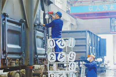 在中国铁路南昌局集团有限公司南昌南车辆段检修库内,职工开启双人合作检修模式,为铁路运输安全筑牢坚实防线。图为8月5日,车辆段职工正在涂打车体标记。 通讯员 陈 松摄