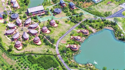 近年来,峡江县积极发展星空露营、民宿等旅游产业,助力乡村全面振兴。图为8月9日,金坪民族乡蝴蝶泉露营基地,一栋栋民族特色民宿木屋与果园、绿水相互映衬,美不胜收。 特约通讯员 陈福平摄
