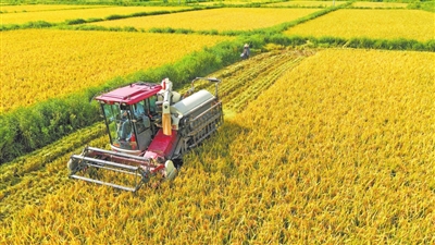 庐山市积极推广播种一次、收获两次的再生水稻技术,通过新技术新品种有效缩短水稻生长周期、降低生产成本,激发农民种粮积极性。图为8月8日,庐山市绿游生态农业开发有限公司再生稻种植基地,农机手驾驶农机收割再生稻。 特约通讯员 韩俊烜摄