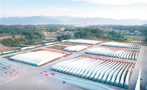 在中材科技(萍乡)风电叶片有限公司,长达数十米的风电叶片整整齐齐摆放在厂区内,正准备发往全国各地风电厂 易伟刚摄