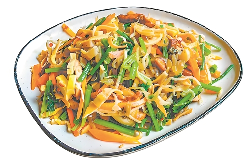 世间滋味有万千种,每家人的年夜饭味道一定有最独特的那道。在我的记忆中,我家的年夜饭必不可少的那道菜就是吉祥八宝菜。 菜的配料其实很普通,主要是红白萝卜、芹菜、油豆腐丝、千张丝、木耳丝、粉丝、花生米等。把它们放在一起翻炒,略放一点醋,爱吃辣的加点小米辣,爽口开胃的小菜,炒制时会做一盆,吃的时候夹一盘出来,随吃随取很方便。腌萝卜的酸,红萝卜的甜,芹菜的清香,花生的脆,各种滋味糅合。我们小镇里每家人都会这道菜,但各家的滋味都不同,配菜也略有差异。有些地方也叫什锦菜、杂菜。平日里其实我家也会炒制这道菜,但简单许多,一般就是到冬日不愿或不便出门,从坛子里拿出两个酸萝卜咸菜,和红萝卜辣椒一起翻炒,爸爸每次说,冬天补营养,荤菜做得多,容易油腻,这个搭搭筷子,有滋味。很奇特,很平常的食物一到年节就高大上了起来,材料丰富了起来,工艺繁多了起来,寓意也吉祥了起来。 中国人讲究好兆头,尤其是老人家在过年的时候喜听吉祥话,后辈小孩多用褒义词,会说好话的得到大人的钟爱,认为他聪明懂事,会有出息。小时候不理解,现在想来,就是情商高,和人相处得舒服。也是,谁不愿听别人说好话、吉祥话呢?大家不管平时相处得如何,到年节的时候互相客客气气的,多祝福祝愿。听多了吉祥话,心里更踏实,祈盼一年风调雨顺,嘉运连连,等好事发生了心情自然愉悦了起来。 我记得除夕那天大早上,妈妈一定会先买好芹菜,是那种白管绿叶的本地芹菜,配色淡雅口感脆嫩。据说这种芹菜种植要特别精心,半个月前就要把芹菜的根茎部分用稻草包裹起来,藏进土里,十多天后颜色变成你想要的样子。这种芹菜长得慢,产量低,说是吃了芹菜一年都会勤奋,做事清白牢靠。小红萝卜要买本地的,代表红红火火,和我妈妈一样想法的人很多,每年除夕菜市场的芹菜、小红萝卜比肉菜更畅销,有时一下子就卖光了,即使涨价,再贵大家还是抢着买,仿佛一定要圆起某个场来。以前说“婆姨盼过节”,在生活困窘时的年节可以改善伙食,炒制八宝菜多了一个菜式,餐桌显得丰盛,现在好日子天天像过节,为健康养生荤腥不敢多吃,八宝菜成了过节最受欢迎的菜。 菜里所蕴含的美好寓意从期盼祝愿一点点变成了现实,劳动创造了美好生活,奋斗开辟新的未来,一个勤劳、善良、奋发向上的家风传承,才能经历多样的精彩,也是希望锦上添花的美事一年比一年多,大家都能被人放在心里,如珠如宝。今年,进入腊月,妈妈又开始和邻居阿姨们相约,你家的酸萝卜腌好了没?我家开始腌渍了,晒萝卜条了。哦,吉祥八宝菜,每年除夕一定会见的老朋友,愿我们在新的一年所遇皆所愿,所愿皆吉祥! □ 江霞