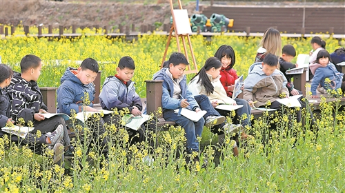 2月9日,石城县3.3万亩油菜花与蓝天暖阳交相辉映,吸引着众多学生前来作画写生。在琴江镇袁梦小镇,学生在老师的带领下走进油菜花田,上一节实景写生美术课,乐享美好春光。 本报全媒体记者 曹章保摄