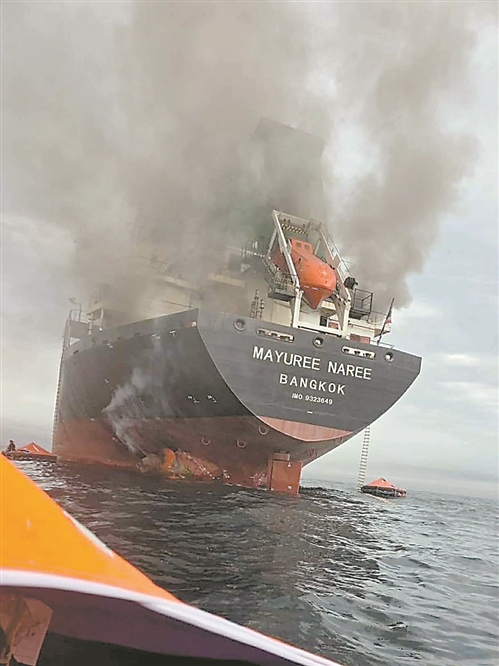 泰国海军3月11日发布的照片显示,一艘泰国货船在霍尔木兹海峡海域遭袭起火。 新华社发(泰国海军供图) |