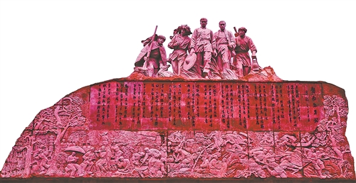信丰油山,是当年中央红军在赣粤边艰苦卓绝三年游击战争的核心区域,陈毅著名的《赣南游击词》,反映的就是那时的峥嵘岁月。大型雕塑《游击赣粤边》(如图),则以视觉艺术形式,定格三年游击史,成为传承红色基因、进行革命传统教育的生动载体。 《游击赣粤边》雕塑高7米,宽14米,气势雄伟,坐落于长征国家文化公园信丰段三年游击战争核心景区,背靠著名的油山主峰。雕塑原创设计者刘世群,也是于都“中央红军长征出发纪念碑”组雕的设计者。为设计《游击赣粤边》雕塑,他深入油山实地体验,采访党史专家和老农等,根据史实反复构思、几易其稿。雕塑者为叶国良、叶秋。雕塑采用“中国红”石材,完成于2021年。 该雕塑主要采用圆雕与碑刻、浮雕三种技法,外形像一枚大印,形式语言新颖独特;远观气势雄伟,环境协调与大山融为一体。其设计手法,突破了传统红色雕塑形式单一的局限,构建了“动态叙事”的视觉效果,实现“历史场景—艺术呈现—精神传递”的三重统一。从内容看,上部的圆雕,塑造了项英、陈毅和油山“三老表”五人立体形象,成为游击将士的典型代表;下部的浮雕群像,描绘了“对月设野营”“野菜和水煮”“支援永不忘”“勤学习”“再请把兵交”等游击岁月中的生动故事场景;中部的《赣南游击词》12首,根据陈毅手书石刻,点明整座雕塑的主题和内核,从而达到“形象+文字”的双重叙事,引导观众深入了解历史背景,产生情感共鸣,留下深刻记忆。 此雕塑通过艺术手法,表现了游击队员勇战斗、显机智、苦坚守、求胜利的革命精神和坚定信念。 “勇战斗”的具象化。手拿斗笠的项英,手拄木棍的陈毅和背着土枪、提着马灯、身披蓑衣的“三老表”,脚踏荆丛,步履坚定,寓意革命道路异常艰难,但他们靠着坚强的革命意志和信念,坚持斗争,不畏牺牲。雕塑人物肢体的紧绷感、神态的专注性,将勇敢的革命者形象刻画得生动传神。 “显机智”的可感知。游击队的官兵个个目光炯炯,这是充满智慧、善于谋略的生动写照。他们正是靠着这种机智,从而在艰险恶劣的环境下战胜了敌人。 “苦坚守”的可视化。雕塑中“野菜和水煮”画面,游击队员有的在切蛇,有的在煮野菜……表现的是生存条件极为艰苦。左下角有一个把雨伞绑在身上看书的队员,寓意革命者在艰苦卓绝的斗争环境中仍不忘学习,从中获得革命的斗志和“前进心不灰”的动力。 “求胜利”的情感化。雕塑中指挥员的坚定、战士们的坚持、老百姓的支援,放哨时高度警惕、冲锋时不怕牺牲的英武......所有情节设计、人物刻画,都是为表现最终夺取革命的胜利。 □ 邱洁