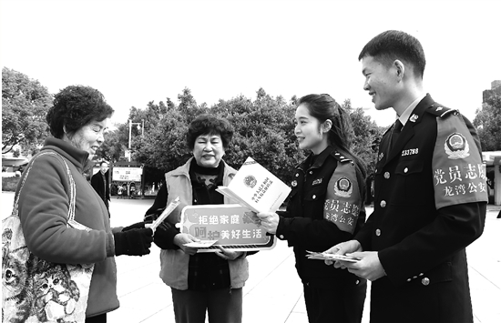 近日,温州龙湾公安状元派出所民警带领志愿者深入辖区开展反家暴宣传活动,引导大家尊法、学法、用法、守法,学会运用法律武器维护自身合法权益。 通讯员 郑斌方 摄