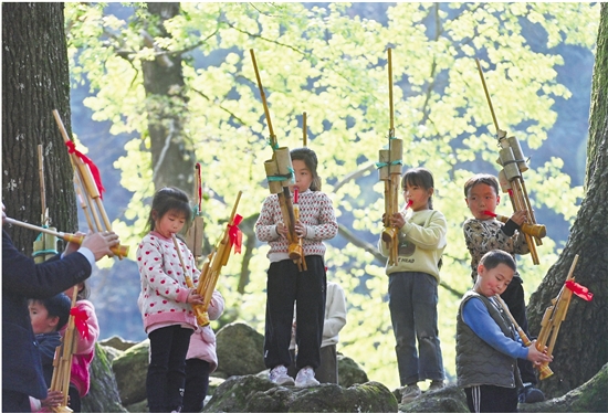 3月28日,广西柳州市融水苗族自治县杆洞乡乌英苗寨教学点的孩子们在练习吹芦笙。 近年来,广西各地积极开展民族文化进乡村校园、进村寨活动,将刺绣、芦笙、陀螺等丰富多彩的非遗文化引进校园课堂和日常生活,促进非遗技艺代代相传。 新华社 黄孝邦