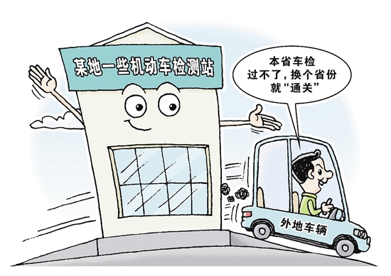 异地“通关” 近期,记者接群众举报称,在河南、安徽省际毗邻地区,一些机动车检测站让年审不合格车辆异地“通关”。记者暗访发现,这些检测站主要客户为外地车辆,一些明显有问题的车辆确实能过关。 新华社 徐骏 作