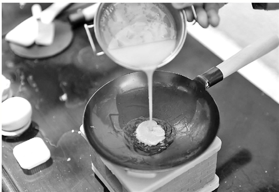 随后,消防员将灶台组装起来,给燃料盒内加注好燃料后点燃,红外测温仪同步测温,很快显示灶台内的火焰温度超过了200℃。待稳定在234℃左右,消防员将小炒锅放置到灶台上,然后倒入少量食用油,待油温升高后,便将准备好的鸡蛋液倒入锅内,只听见嗞嗞声响起,鸡蛋很快被炒熟,锅内多余油星向锅外飞溅。