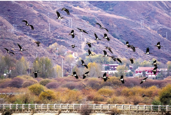 近日,成群的黑鹳来到四川省炉霍县鲜水河国家湿地公园内栖息觅食,形成一道靓丽风景。