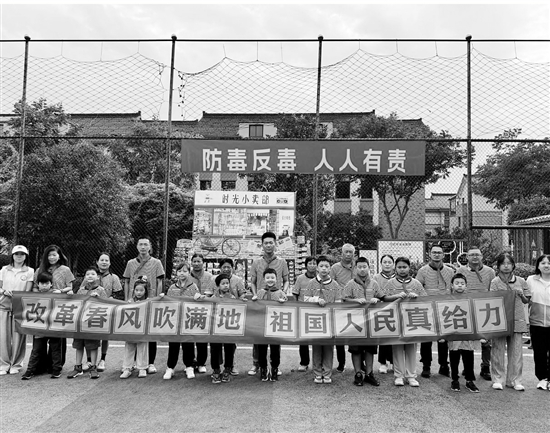 “编,编,编花篮,远离‘毒品’要记牢。”孩子们手拉手、脚勾脚,围成圆圈欢快跳跃。近日,海宁市马桥街道禁毒部门联合社工站推出“回到90年代”主题禁毒活动,以充满年代感的游园会替代传统宣传。滚铁环、编花篮、夹零食等经典游戏融入禁毒元素,让知识在趣味互动中自然传递。