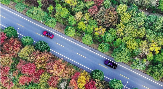 11月10日,长兴县合川线,车辆行驶在农村公路上,与色彩斑斓的树木相互映衬,风景如画。