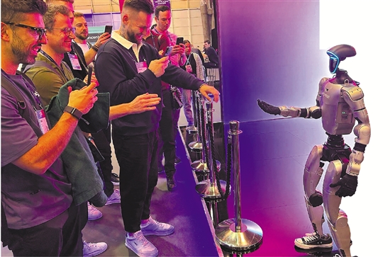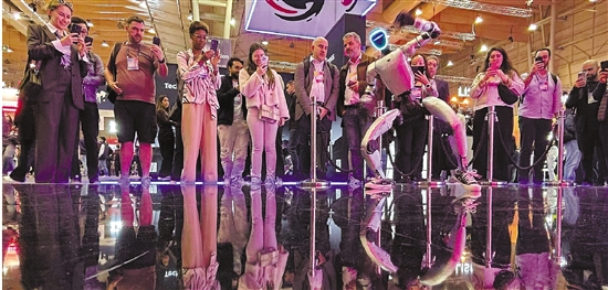 当地时间11月11日,来自中国杭州的宇树科技人形机器人,在葡萄牙里斯本全球网络峰会上火爆全场。穿着帆布鞋的宇树机器人大秀热舞,吸引了众多来自全球各地的与会者,许多人立刻“路转粉”,和宇树机器人互动合影。这场全球瞩目的科技盛会上,今年出现频率最高的一个词就是“中国科技”。 钱璐斌 摄