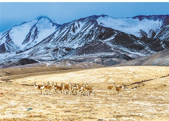 11月14日,国家二级保护野生动物藏原羚在甘肃省阿克塞县阿勒腾乡哈尔腾草原活动觅食(无人机照片)。 哈尔腾草原位于青藏高原北缘,平均海拔超过3800米,地处甘肃省阿克塞哈萨克族自治县阿勒腾乡。这片秘境汇聚了雪山冰川、广袤草原与荒漠峡谷等多元地貌,成为众多高原野生动物繁衍生息的乐园。 入冬以来,作为哈尔腾草原旗舰物种的野牦牛、藏原羚等珍稀物种,陆续迁徙至海拔较低处活动觅食,为寂静的冬日荒原增添了生机与活力。随着当地生态保护力度的持续加大,这些“高原精灵”的种群数量正稳步增长。 新华社 郎兵兵 摄