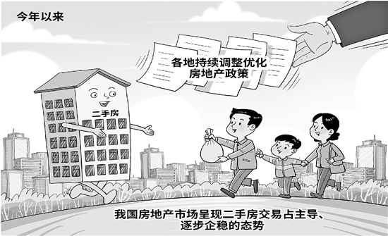 取消或调减限制性措施,实施购房补贴、发放住房消费券,优化供给、精准供地……今年以来,各地持续调整优化房地产政策,我国房地产市场呈现二手房交易占主导、逐步企稳的态势。