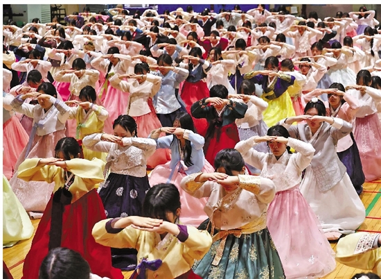 韩国女子高中生身着韩服参加毕业典礼。