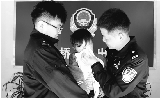 近日,临海公安杜桥派出所民警在出警路上“捡”到一个3岁左右的小朋友。因为小朋友说不清楚家长信息,民警便将其先带回派出所,很快就和孩子母亲打来的报警求助电话“对”上了。图为等待孩子母亲前来时,民警抱起哭闹的孩子安抚,并轻柔地给孩子擦眼泪。