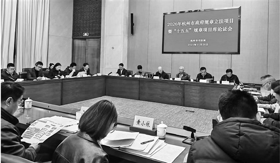 本报讯 11月26日下午,杭州市司法局召开2026年政府规章立法计划项目论证会,一批立法项目被提上日程。公共政策健康考量、互联网租赁自行车规范、强对流天气灾害防范应对等百姓关心的话题,纳入专家论证,用制度保障让城市更有温度。