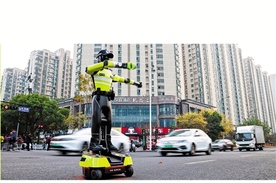 12月1日,杭州市滨江区滨康路长河路口迎来一名酷炫的交警新成员——AI交通管理机器人“杭行1号”。 “杭行1号”既能流畅做出直行、停止等标准指挥动作,又能识别未佩戴安全头盔、越线停车、行人横穿斑马线等交通违法行为,并发出语音提醒。 潮新闻记者 姚颖康 摄