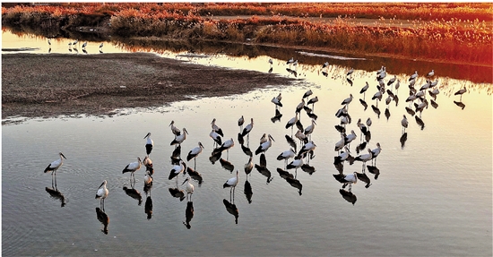 近日,大批东方白鹳飞抵河北省唐山市丰南区沿海湿地觅食、停留,形成一道靓丽的风景。