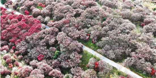 连日来,湖州市吴兴区道场乡红介山上千株红枫色彩渐变,呈现“红叶海洋”般的视觉效果,景美如画。