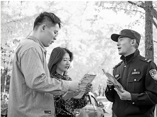 近日,嘉兴市“网红路”三塔路两侧银杏染黄枝头,吸引众多市民游客打卡。新兴派出所组织民辅警发放反诈宣传单页,介绍近期高发的电信网络诈骗案例,筑牢反诈防线。