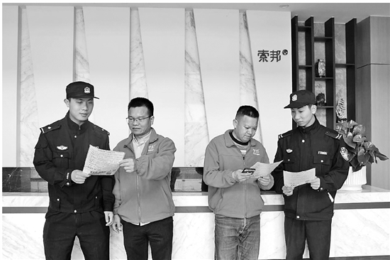 “三线并进”护发展 今年以来,永康公安龙山派出所坚持以“共富警务”为引领,紧扣企业与群众的“急难愁盼”,通过涉企服务、安全防范、民生保障“三线并进”,织密平安防护网,夯实共同富裕的平安基石。图为民警送法入企。 通讯员 项淑清 摄