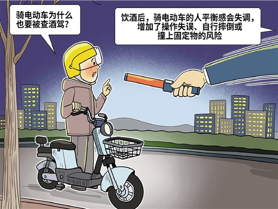电动自行车,被骑行者亲切地称为“小电驴”,近年来凭借轻便灵活的特点,成为不少人的出行首选。然而,闯红灯、骑车拍照、人行横道骑行等违法、违规、不文明骑行,也时常带来安全隐患。 有人可能会问,骑电动车为什么也要被查酒驾?“电动自行车需要一定的平衡技巧来操控,而且车辆对骑行人几乎没有保护。饮酒后,人的平衡感会失调,增加了操作失误、自行摔倒或撞上固定物的风险。”北京市公安交管局朝阳交通支队安全监督管理中队中队长王泽地介绍。 新华社 朱慧卿