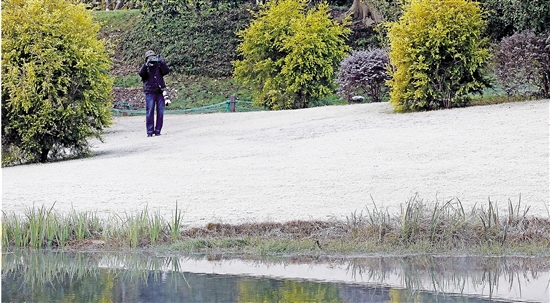 12月15日清晨,杭州太子湾公园的草坪上寒霜覆盖,宛如铺了一层白雪。当日,杭城最低气温临近冰点,仅有0.2℃,刷新今年入冬以来的最低气温。气象预报显示,未来一周杭州将持续晴好天气,气温会稳步回升。 潮新闻记者 林云龙