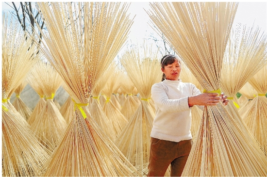连日来,长兴县泗安镇师姑岗村,工人正在晾晒加工好的毛竹条。近年来,长兴县积极利用转化毛竹资源,进行精深加工,将生产竹原料加工成竹筷、竹帘、竹椅、凉席等竹制品出售,提高附加值,增加村民收入,助力乡村振兴。