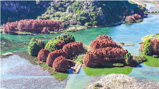 12月16日,云南省文山壮族苗族自治州丘北县普者黑国家湿地公园层林尽染景色美如画(无人机照片)。