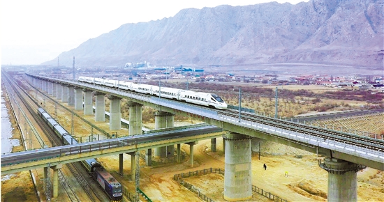 12月23日,D4667次动车组列车行驶在包银高铁跨215省道特大桥上(无人机照片)。 12月23日,包银高铁包惠段正式建成通车,包银高铁全线贯通运营,“八纵八横”高速铁路网京兰通道全线贯通,完善了西北地区高铁路网,为新时代西部大开发注入新动能。 新华社 刘皓 摄