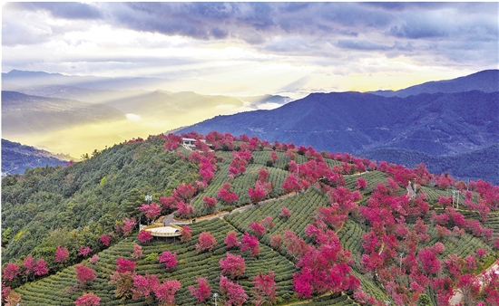 这是12月24日在无量山樱花谷拍摄的日出时分的茶园和樱花(无人机照片)。 进入12月,云南省大理白族自治州南涧彝族自治县无量山樱花谷的冬樱花陆续绽放,与茶园、云海构成一幅美丽的山水画卷。 近年来,南涧彝族自治县围绕“茶区变景区、茶园变公园、茶山变金山”,积极探索以绿色为底色的富民强县新路子,大力推动茶文旅融合发展。 新华社 陈朔 摄
