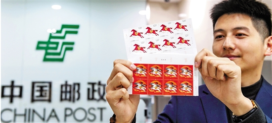 1月5日,中国邮政长兴县分公司集邮门市部工作人员展示《丙午年》特种邮票。中国邮政于1月5日发行《丙午年》特种邮票一套2枚,邮票图案名称分别为:驰跃宏图、万骏臻福,全套邮票面值为2.40元。计划发行量分别为套票2668万套,小版162万版,小本票280万本。 许扬 摄