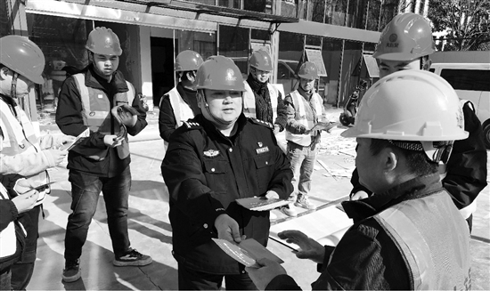 近日,台州椒江公安府前派出所民警戴上安全帽深入工地,为工人们讲解反诈知识,发放宣传资料,提醒大家捂紧“钱袋子”,避免不必要的经济损失。 通讯员 何文斌 摄