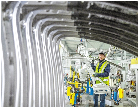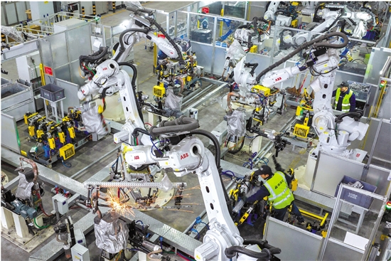 1月4日,位于长兴县的长兴晟铭汽车部件有限公司里,全自动机器人高速运转,全力赶制吉利第五代帝豪、吉利银河星耀6新能源汽车白车身订单产品。