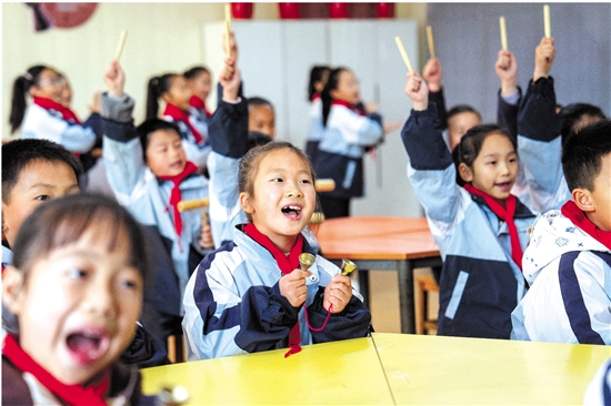 “一琴多器” 1月13日,在南县三仙湖镇中心小学,学生在练习碰铃。 近年来,湖南省益阳市南县加大对乡村小学音乐教育的支持力度,构建以口风琴为核心、多种小乐器协同的“一琴多器”教学模式,通过设计“技能奠基—协作合奏—创意表达”三阶内容,融入节奏游戏、小组合作与创编活动,提升乡村小学生的音乐素养。当地还结合音乐教师“送教下乡”机制,增加小学美育教育师资力量,促进城乡义务教育均衡发展。 新华社 陈思汗