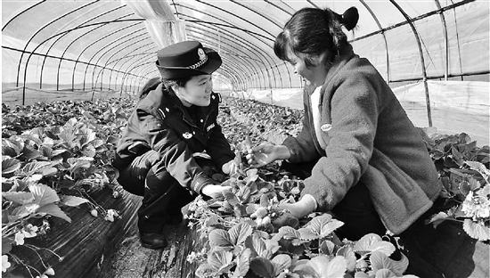 连日来,东阳市公安局南市派出所扎实推进“冬季攻坚行动”,民警勤访乡村,宣讲防诈等安全知识。图为近日民警走访草莓种植户。