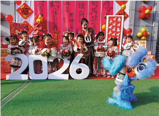 1月14日,四川省遂宁市高新区瑰宝明珠幼儿园举办迎新春非遗庙会,一只身披舞狮服的机器狗在活动上亮相,为师生送来温馨祝福。