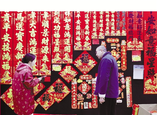 1月7日,义乌国际商贸城喜庆用品专区,来自各地的买家正在选购农历马年节庆用品。农历马年尚未到来,但专区内已经是满满的年味,马元素的对联、挂历、年画等产品已进入销售高峰期。 朱海伟 摄