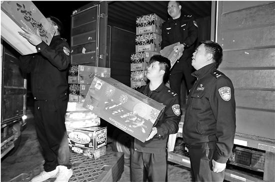1月6日晚,临海公安杜桥派出所会同交警中队查获一起非法储存、运输烟花爆竹案,现场查扣312箱烟花爆竹。图为执法人员清点转运查扣的烟花爆竹,及时消除安全隐患。