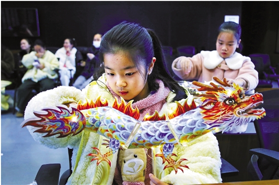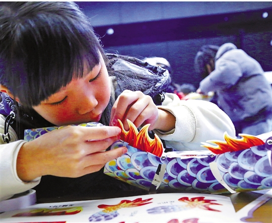 1月11日,玉环市博物馆,小朋友在老师指导下制作花龙灯,准备带回家欢欢喜喜闹新春。