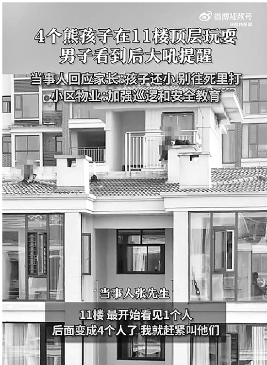 近日,湖南怀化一小区内,4名孩子在11楼顶层玩耍,居民张先生发现后大声呼喊提醒。事后张先生表示,自己当时没想太多,只想让孩子们赶快离开危险区域,等他们离开后,才感到后怕。物业回应称,部分顶楼门锁已被破坏,将加强巡查与安全教育。寒假临近,提醒各位家长务必关注孩子安全。