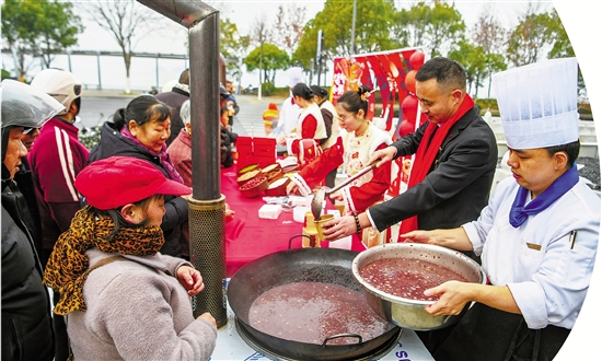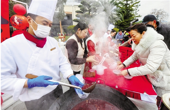 腊八节将至,淳安县30余家酒店、餐饮企业共同发起感恩回馈活动。1月25日清晨,在千岛湖中心湖区旅游码头等处,一碗碗热气腾腾的腊八粥被分送到游客和市民手中。 通讯员 杨波 摄