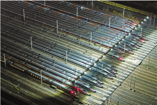 2月2日凌晨,检修完的动车组列车停靠在长沙动车运用所(无人机照片)。
