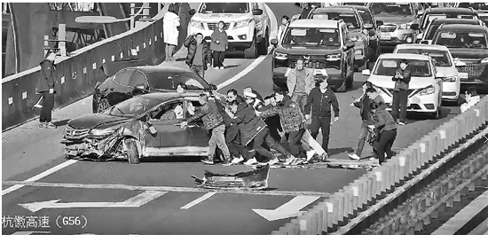8时18分,在陈海鹏的组织下,众人站成一排,双手抵住侧翻的车身。“一、二、三,起!”齐声呐喊中,众人同时发力。短短6秒钟,侧翻车辆被稳稳扶正。