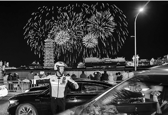 春节期间,长兴县公安局民辅警坚守一线,守护平安,确保群众度过欢乐祥和的新春佳节。图为民辅警在太湖龙之梦景区维护治安秩序,成为一道亮丽的“风警线”。