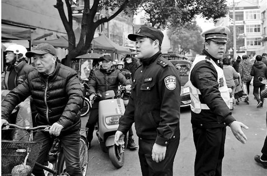 春节假期,街上人流量和车流量剧增,临海公安杜桥派出所和交警中队的民辅警上街开展“疏堵保畅迎新春”行动,为群众创造良好出行环境。图为民辅警在人流密集路口疏导交通。