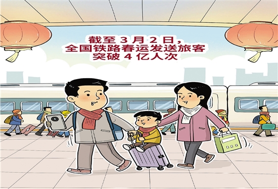 记者3月3日从中国国家铁路集团有限公司获悉,截至3月2日,全国铁路春运累计发送旅客4.07亿人次。其中,3月2日,全国铁路发送旅客1320.8万人次,运输安全平稳有序。3月3日,全国铁路预计发送旅客1070万人次,计划加开旅客列车743列。 新华社 朱慧卿