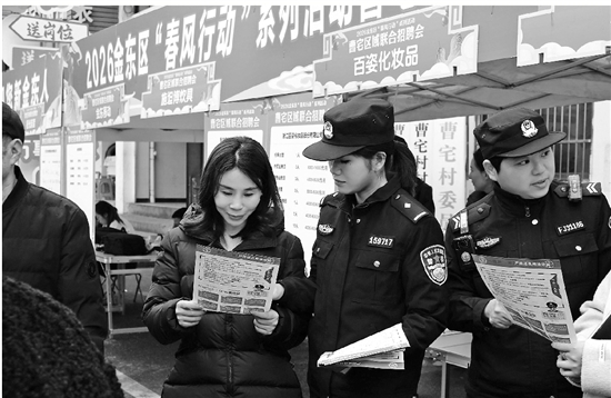 日前,金华市公安局金东分局曹宅派出所借辖区招聘会人流密集之机,设立反诈宣传摊位,通过发放单页、剖析案例等方式,向求职者详解“高薪兼职”“刷单返利”等诈骗套路,在送岗位的同时送上“平安符”,切实增强群众防骗“免疫力”。 通讯员 黄驰 章欣莹